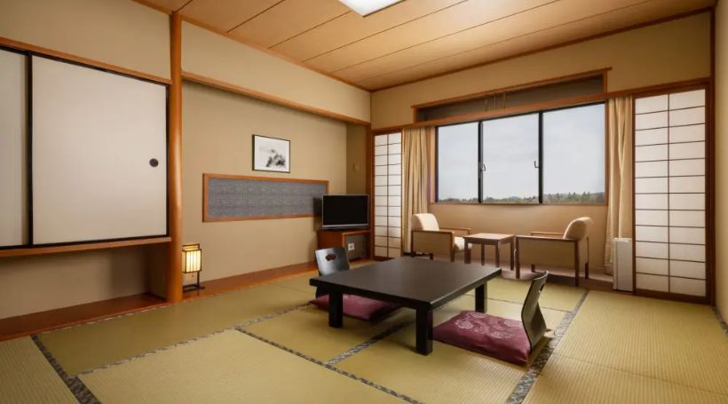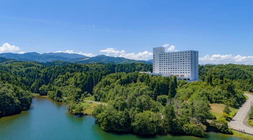富山県砺波市は金沢、富山観光のちょうど真ん中に位置します。西の金沢からアルペンルートまで、北陸旅行に欠かせない観光地まで車で約1時間で行ける好立地です。日本の原風景 砺波平野散居村がホテルの客室から眺められる。ホテルの廻りは緑に囲まれたどこか懐かしい景色が広がります。