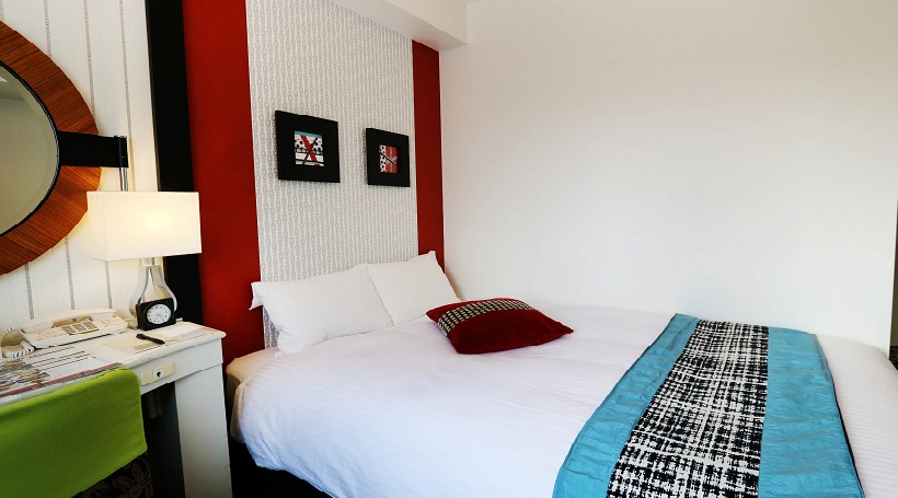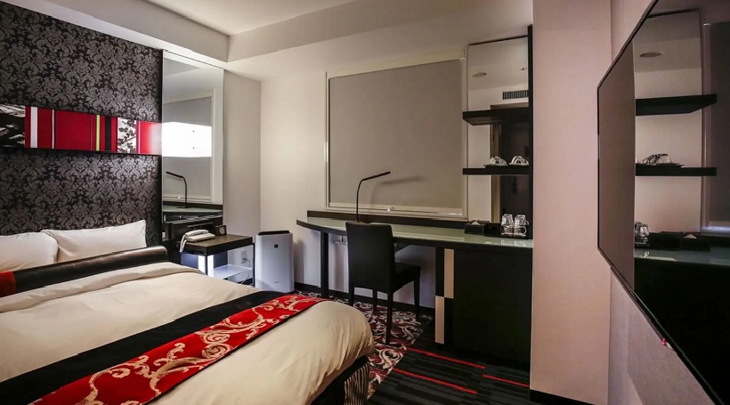 赤にモノトーンのカラーコーディネートをプラスした、モダンでシンプルなクールデザイン。和紙の抽象的な墨画をコラージュしたアートなど、「和」のテイストを散りばめた客室です。